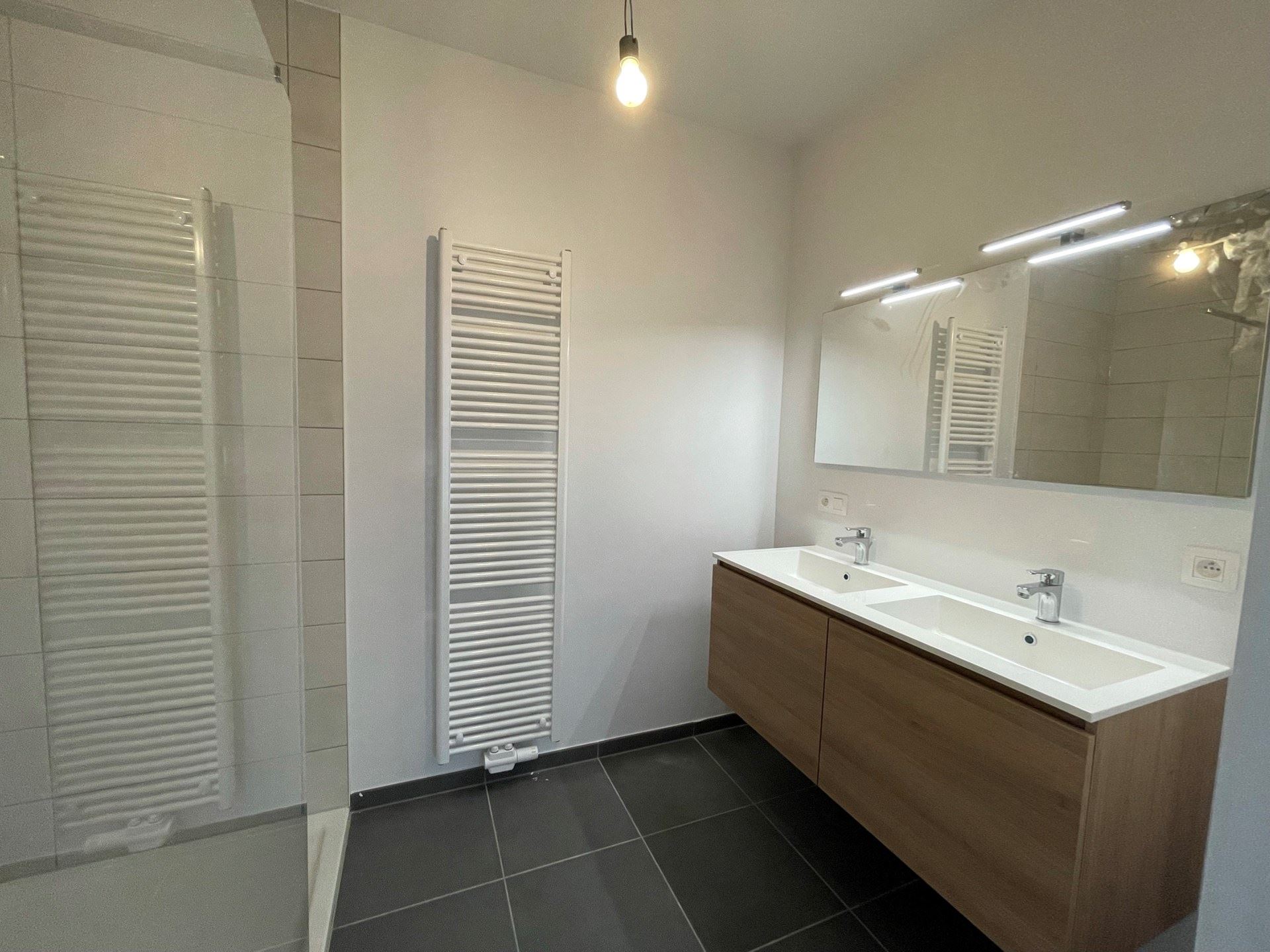Nous entrons dans cet appartement de 2 chambres par le hall d'entrée où vous trouverez le grand séjour avec cuisine ouverte équipée (équipée de : plaque à induction, hotte aspirante, évier, lave-vaisselle et réfrigérateur). L'accès direct à la terrasse très spacieuse est un gros plus et assure beaucoup de luminosité. La salle de bain est équipée d'une spacieuse douche à l'italienne et d'une double vasque avec miroir. Sous-sol : débarras et parking.