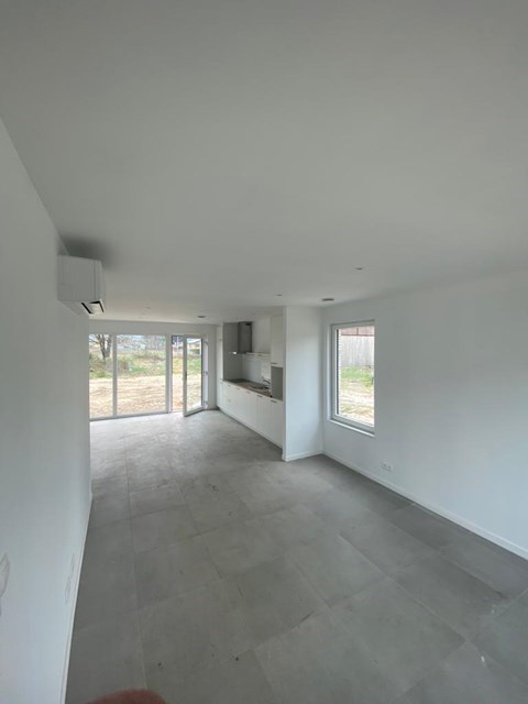 We  betreden deze energieneutrale halfopen nieuwbouwwoning via de inkomhal waar we eveneens het gastentoilet terugvinden. Verderop vinden we de zitruimte met aansluitend de uitgeruste open leefkeuken en berging met zicht en directe toegang op de ruime tuin. De tuin en het terras werden intussen aangelegd en afgewerkt en de ruime buitenberging werd eveneens geplaatst. Op de eerste verdieping vinden we de nachthal die toegang geeft tot de 3 slaapkamers, een 2e berging en de badkamer met inloopdouche, dubbele wastafelkast en toilet.
