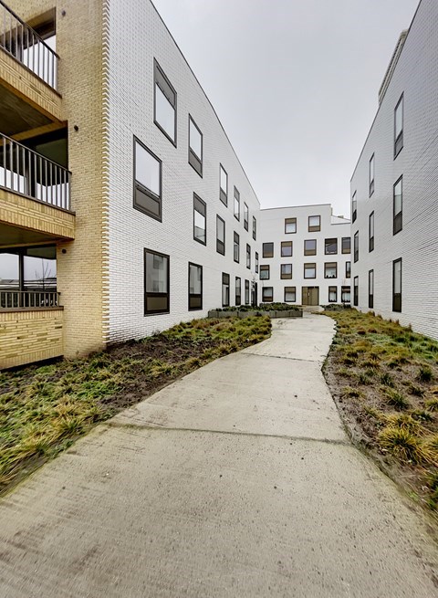 Spacieux appartement de deux chambres avec une cuisine ouverte, un salon suivi d'une terrasse intime également accessible depuis la chambre à coucher.